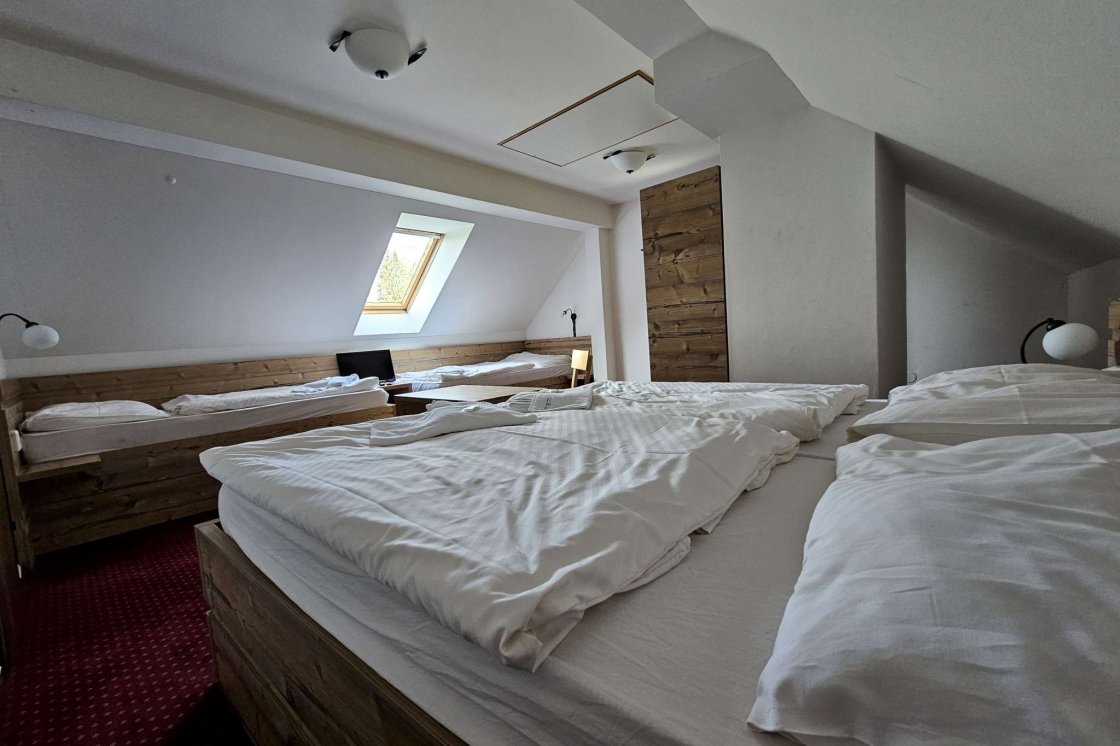 Podkrovní čtyřlůžkový pokoj s manželskou postelí. Samozřejmostí je vlastní koupelna se sprchovým koutem, toaletou a ručníky. V pokoji je také TV. Ke každému pokoji je vlastní uzamykatelný prostor v lyžárně a kolárna.